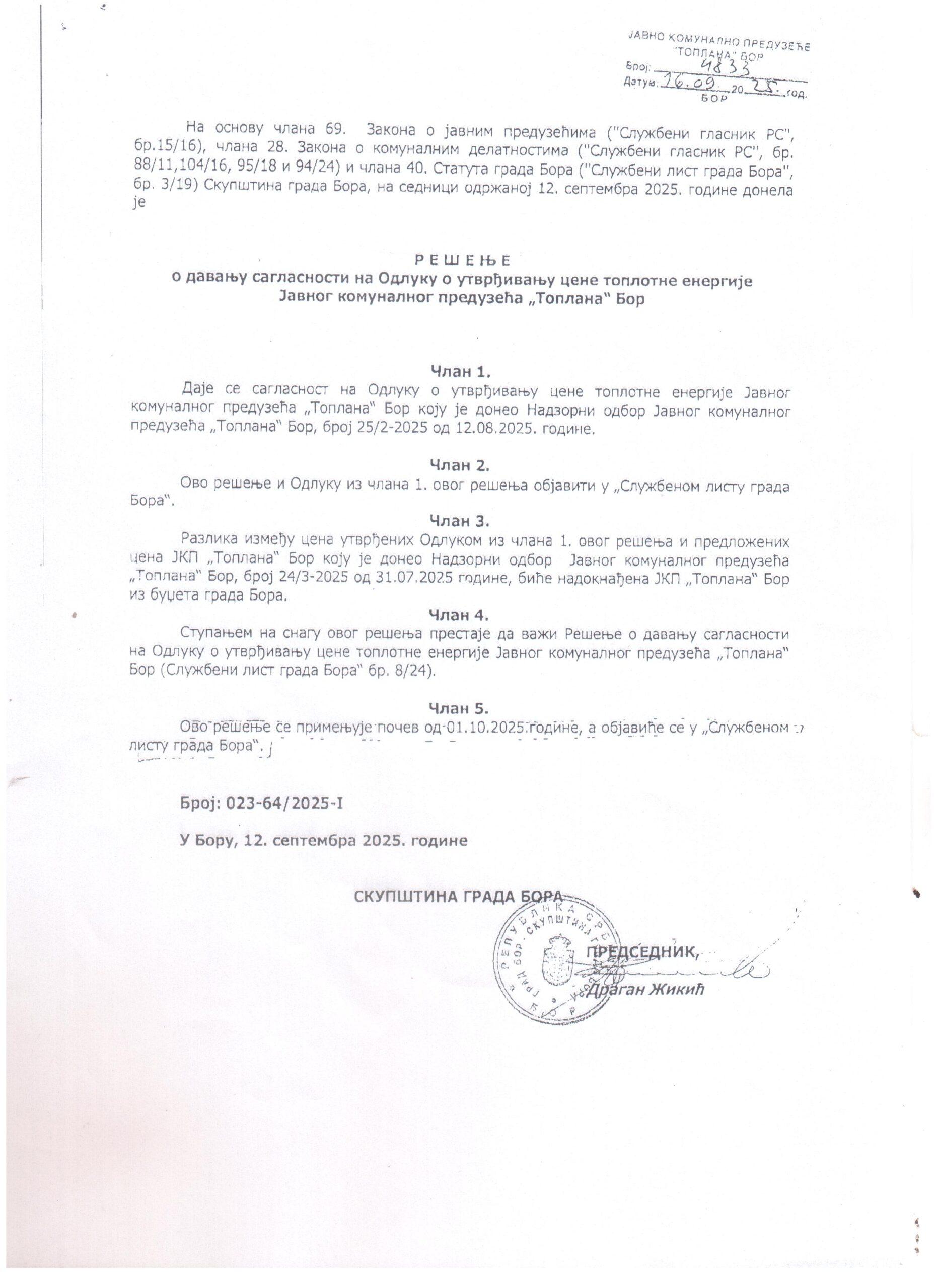 Решење о давању сагласности на Одлуку о утврђивању цене топлотне енергије Јавног комуналног предузећа “Топлана“ Бор септембар 2019.